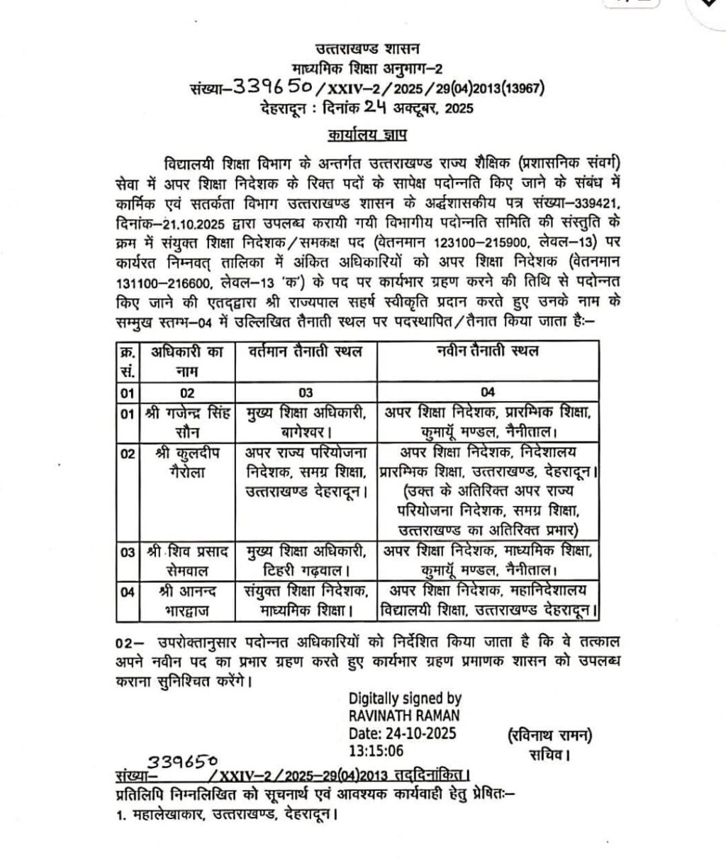 शिव प्रसाद सेमवाल को अपर शिक्षा निदेशक, माध्यमिक शिक्षा (कुमाऊं मंडल) पद पर पदोन्नत किया गया है। तो वहीं आनंद भारद्वाज को अपर शिक्षा निदेशक महानिदेशालय विद्यालयी शिक्षा बनाया गया है।